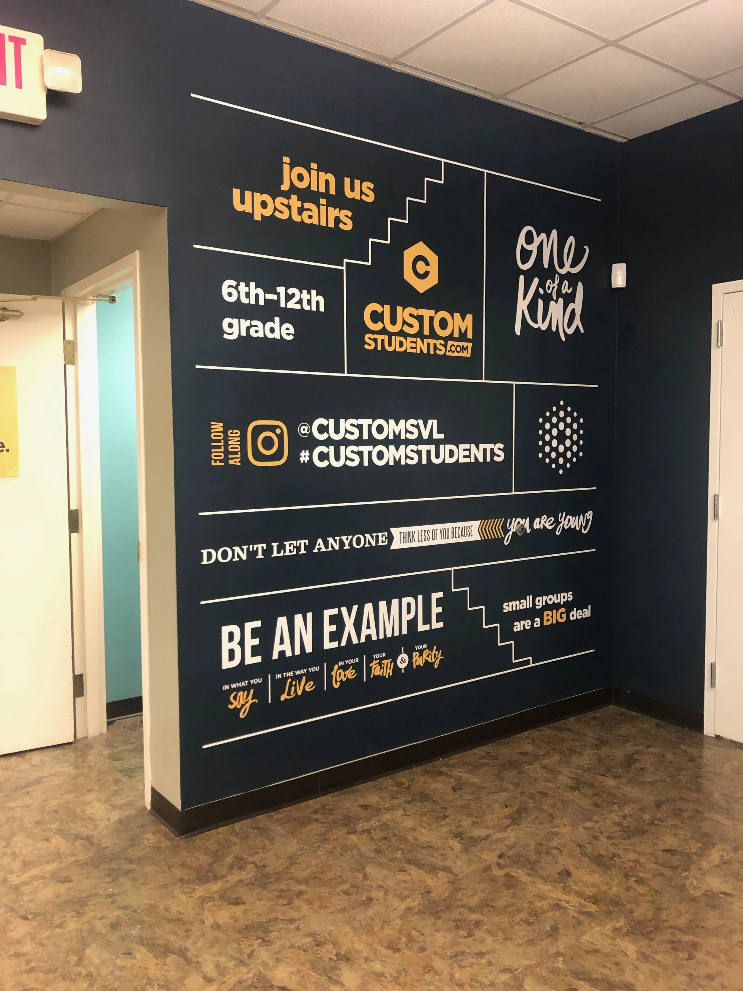 Here is the most recent design for Custom Students at Seacoast’s Summerville Campus. The wall was originally white, but since the hallway is so long and narrow I suggested painting the wall dark to really anchor the piece and draw your eye to the end of the hallway. Its use is directional, informational, and decorative.